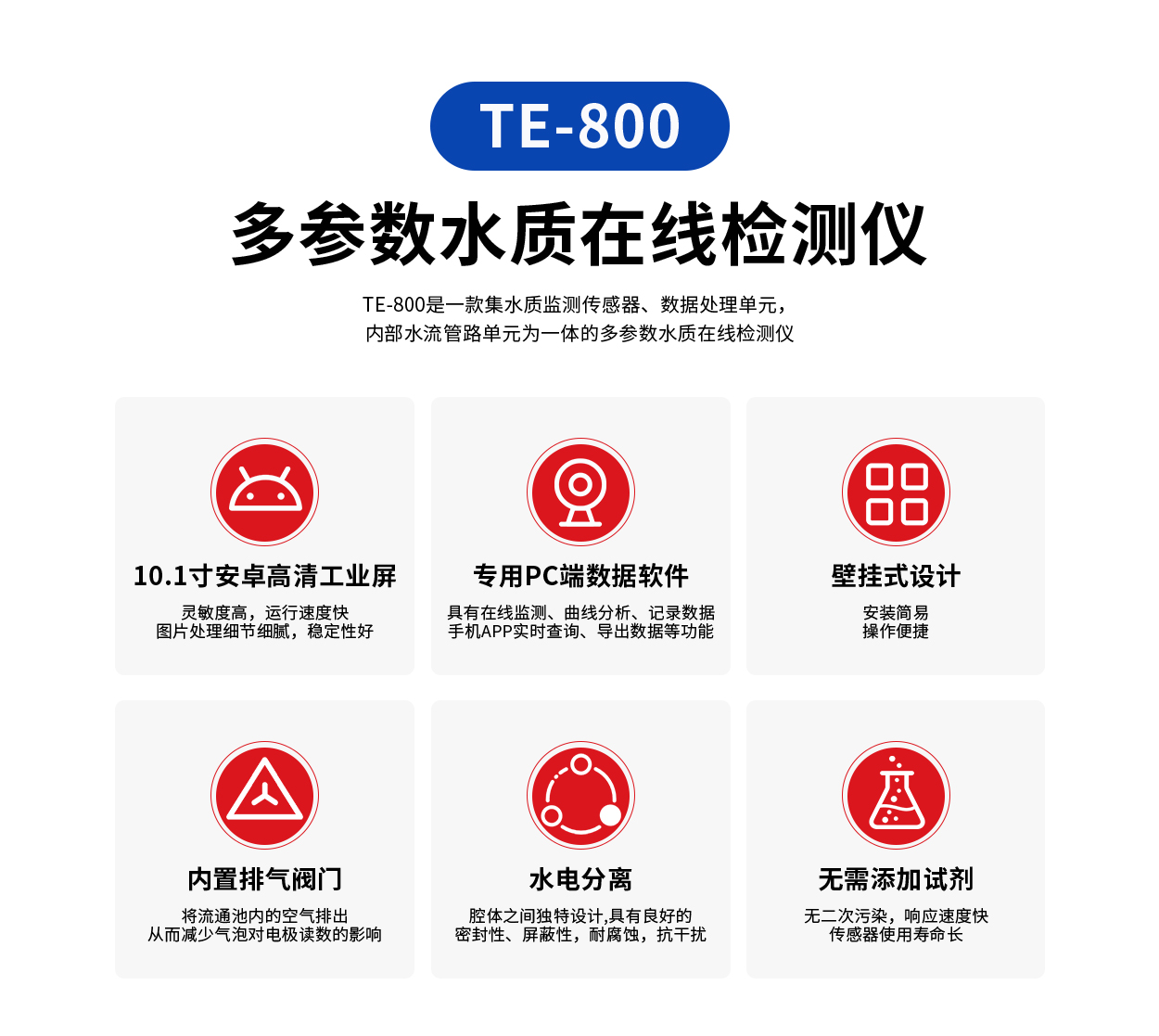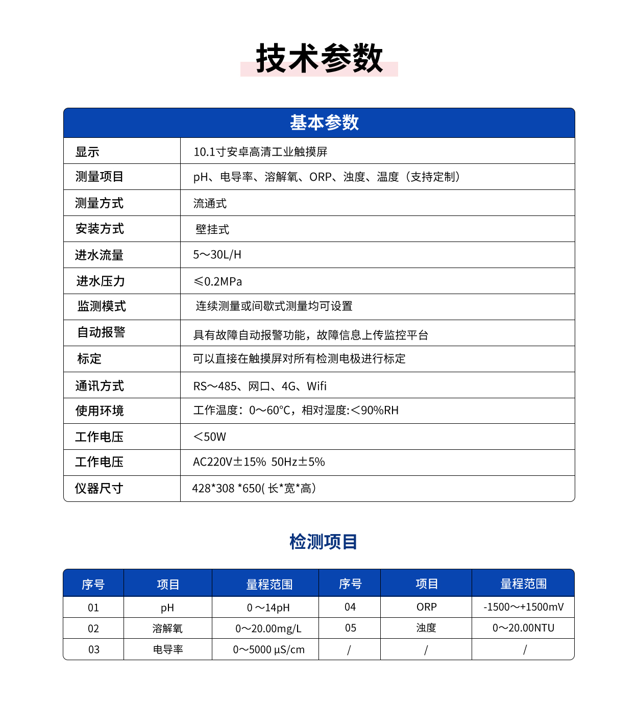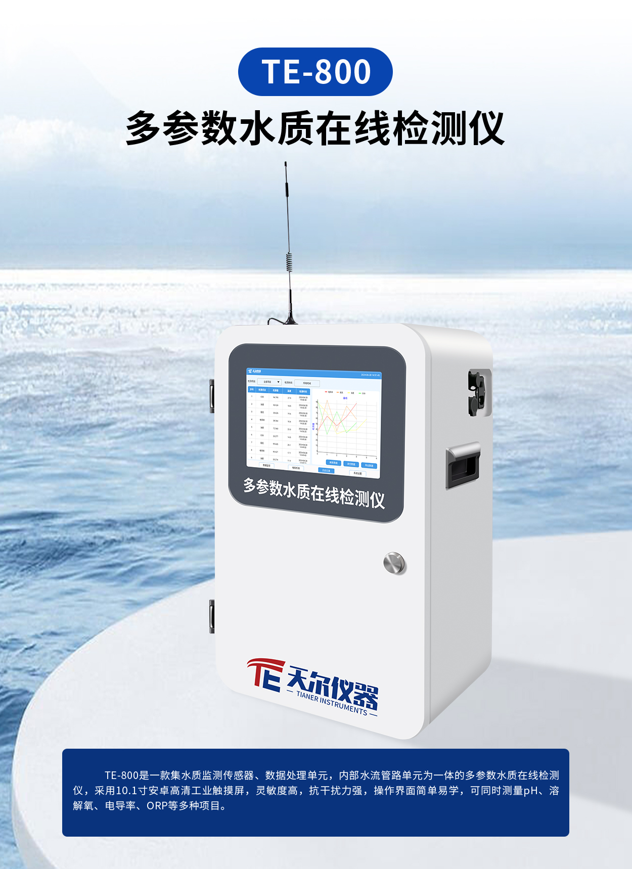 常规检测项目:pH、水温、电导率、浊度、溶解氧、ORP