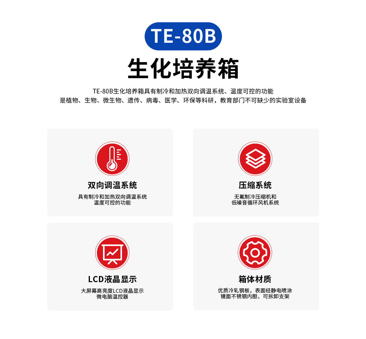 概述:生化培养箱具有制冷和加热双向调温系统、温度可控的功能,是植物、生物、微生物、遗传、病毒、医学、环保等科研,教育部门不可缺少的实验室设备,广泛应用于低温恒温试验、培养试验、环境试验等.