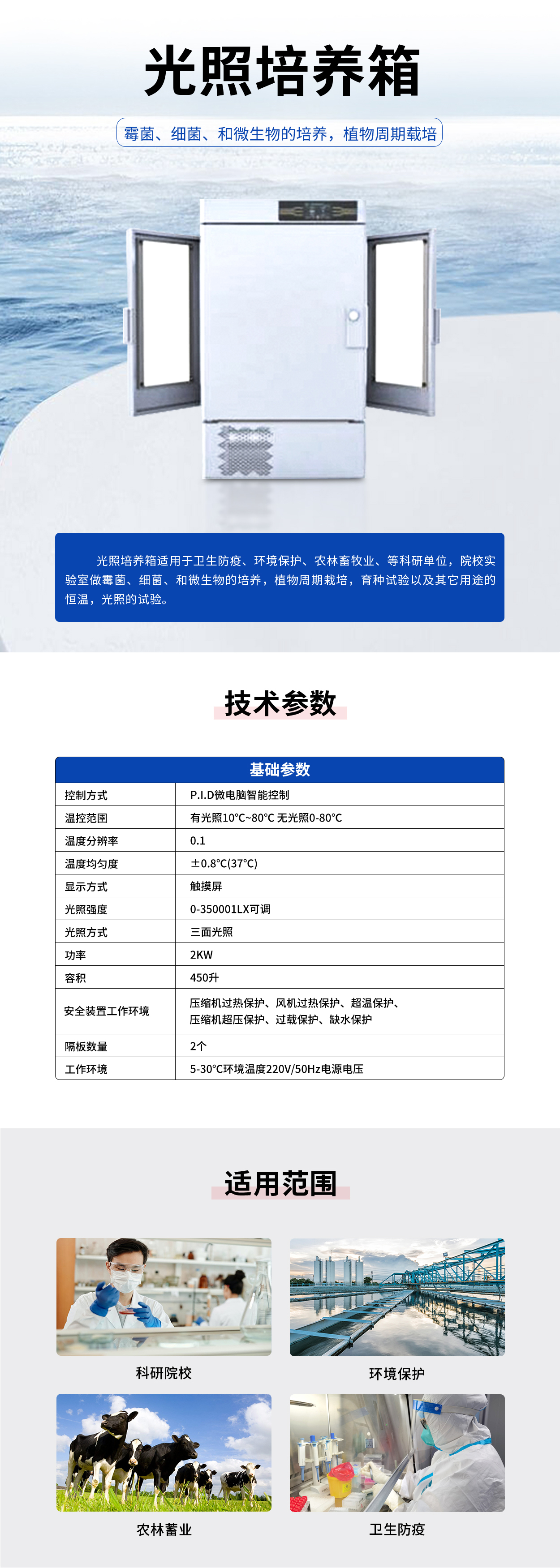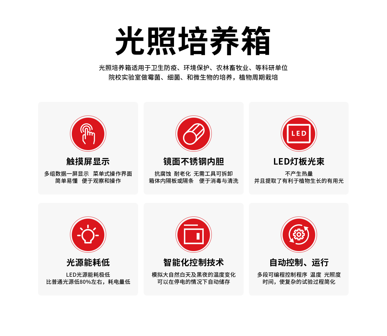 概述:光照培养箱适用于卫生防疫、环境保护、农林畜牧业、等科研单位,院校实验室做霉菌、细菌、和微生物的培养,植物周期栽培,育种试验以及其它用途的恒温,光照的试验.